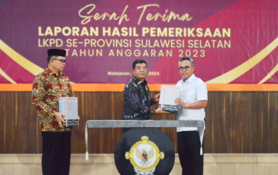 Ketua DPRD Luwu Timur, Aripin mendampingi bupati Lutim, Budiman dalam serah terima penyelenggaraan laporan hasil pemeriksaan (LHP) atas LKPD lutim TA 2023 dari kepala BPK RI Perwakilan Sulawesi Selatan.