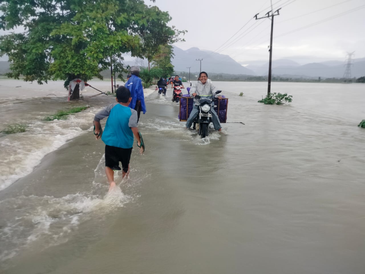 “pengendara tidak dapat menguasai motornya, babinsa koramil mangkutana (Serda Agustinus) dan relawan memandu pengendara untuk melewati genangan air sekitar 150meter